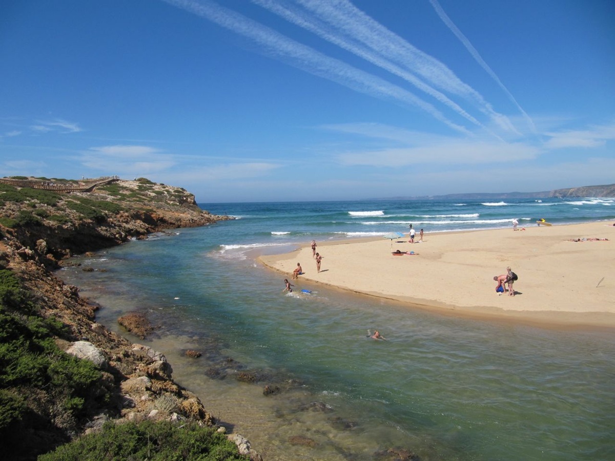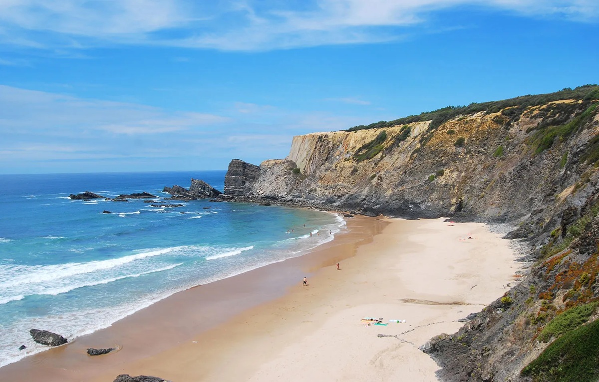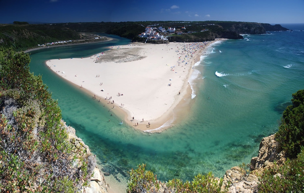 Where the Seixe River meets the Atlantic, Praia de Odeceixe is a unique and picturesque beach on the border of the Algarve and Alentejo regions. Its distinctive river-beach combo makes it perfect for both swimming in the calmer river waters and bodyboarding in the ocean waves. Surrounded by green hills, it’s a truly scenic spot loved by families and surfers alike.