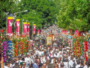 O traço mais característico desta festa é o Desfile ou Procissão dos tabuleiros, que representam as freguesias do concelho e percorre a ruas de Tomar por 5 km, ladeado pelas colchas que a população pendeu à janela, e os milhares de visitantes que vêm se deslumbrar por essa profusão de cores.
