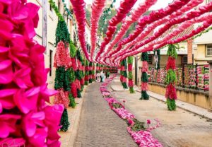 Outra das tradições mais antigas e originária de Tomar presente na Festa dos Tabuleiros, são os tapetes de flores de papel nas ruas da cidade. As ruas do centro histórico e hoje em dia um pouco por toda a cidade são ornamentadas com flores dando cor e alegria à cidade templária. Recentemente, no final do séc. XX, a decoração das ruas com tapetes de flores de Tomar começou a ser replicada por outras festividades em todo o país, embora com uma dimensão bastante menor.